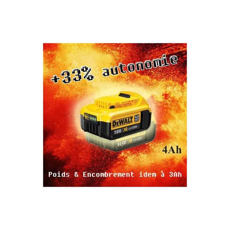 Nouvelle batterie en 4Ah +33% d autonomie, même poids, même encombrement ! Mieux anticiper grâce au témoin de charge ! Les nouvelles batteries en 18V sont équipées d un témoin de charge manuel. Ce dernier permet d anticiper le niveau de chargement, évitant de mauvaises surprises en arrivant sur les chantiers !