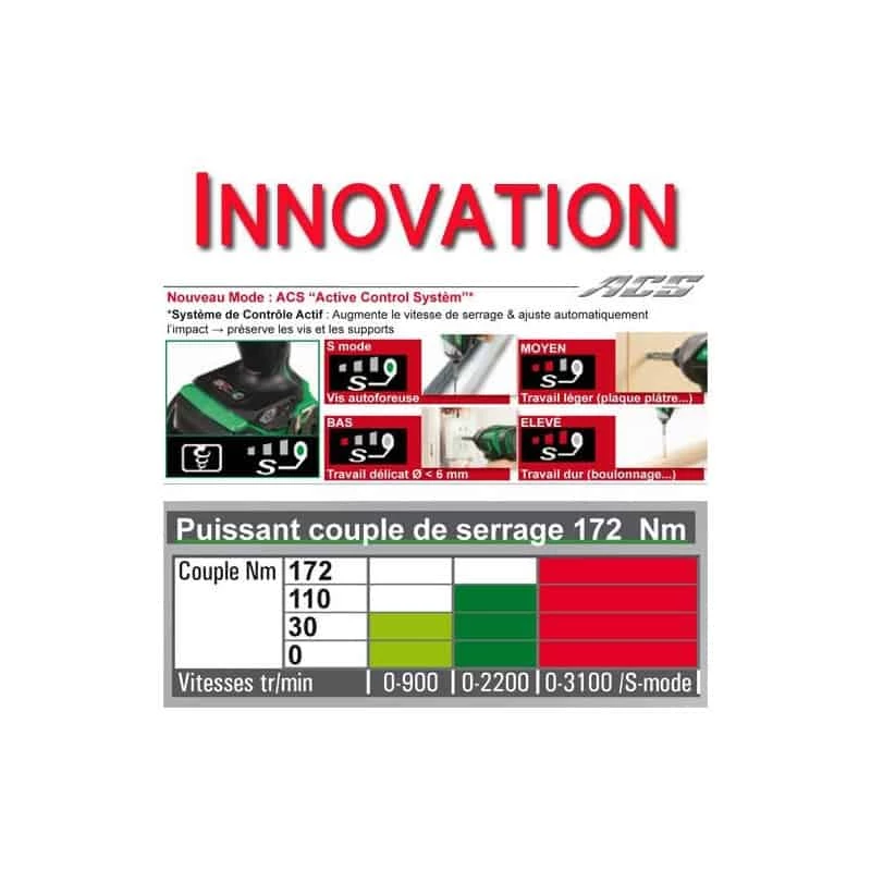 Hitachi ACS: Active control System, augmente la vitesse de serrage et ajuste automatiquement l’impact, ce qui préserve les vis et les supports.