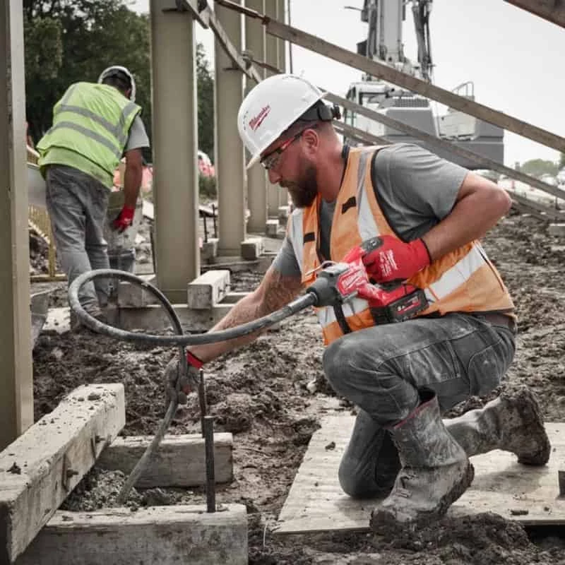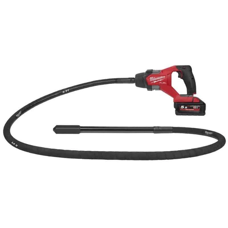 Avec son arbre flexible de 2,40 mètres de longueur, l’aiguille vibrante M18 FCVN24 de Milwaukee est idéale pour compacter dans les linteaux, les murs et les poteaux en béton.