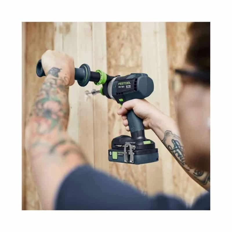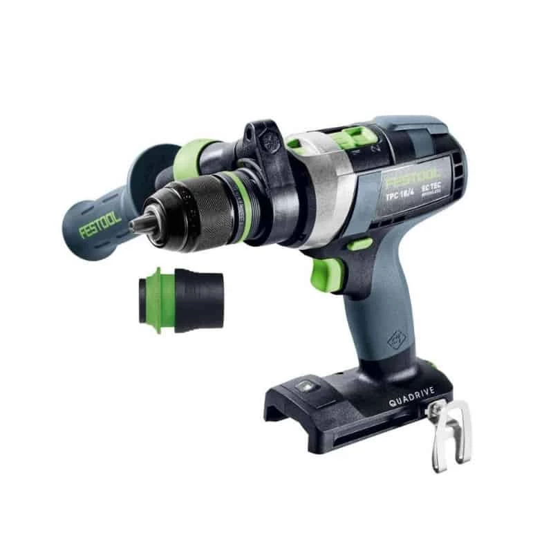Pour les opérations de perçage et de vissage avec de grands diamètres : la perceuse-visseuse à percussion sans fil QUADRIVE TPC 18/4 Festool transmet des forces et des vitesses exceptionnelles grâce à son robuste réducteur métallique à 4 vitesses. Ainsi, le vissage tout en puissance à un couple de 75 Nm, à la 1re vitesse, et le perçage précis à 3600 tr/min, à la 4e vitesse, deviennent un jeu d’enfant. Qu’il s’agisse de bois ou de métal, ou encore de maçonnerie grâce à la frappe axiale activable : la TPC 18/4 est d’une solidité exceptionnelle et garantit, grâce à son moteur EC-TEC sans charbons et sans maintenance, un haut niveau d’endurance.