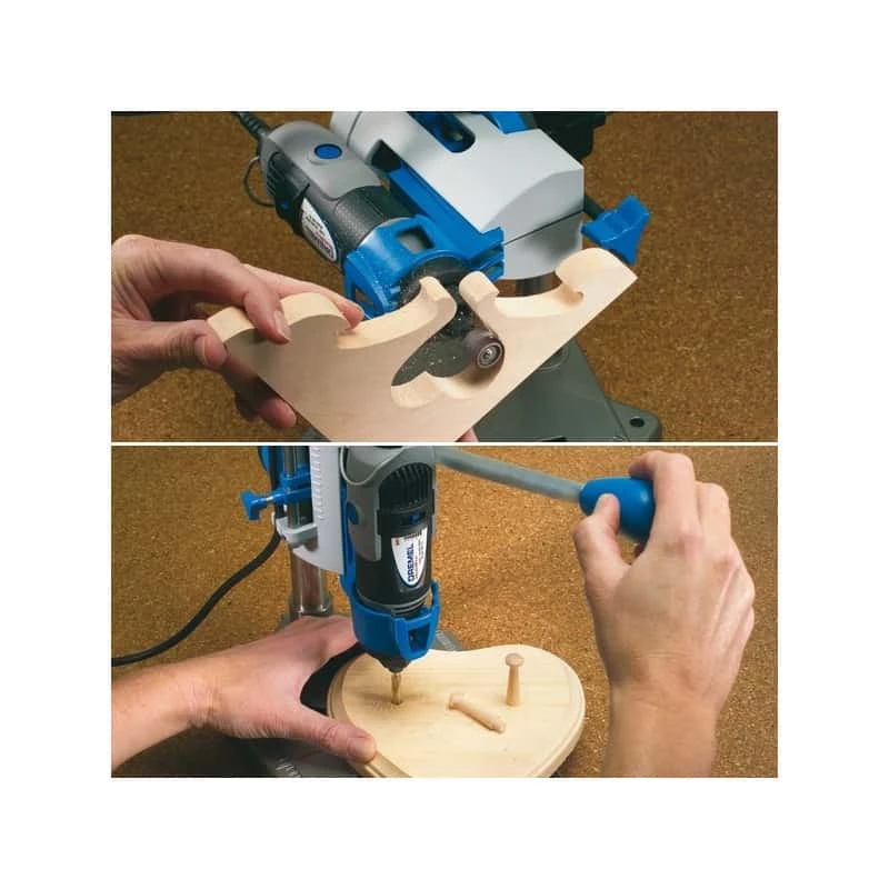 Ce support de perçage et support d’outil combiné constitue la solution pour tout travail stationnaire avec un outil Dremel. Pour un perçage vertical ou dans un angle, réglage par incréments de 15 degrés. Permet de tenir l’outil à l’horizontal pour le polissage ou le ponçage. Outil télescopique intégré pour maintenir l’outil avec l’arbre flexible (225). Avec espace de rangement des accessoires. Système sécurisé de rangement du cordon d’alimentation. Repères de marquage de la profondeur pour une manipulation cohérente.