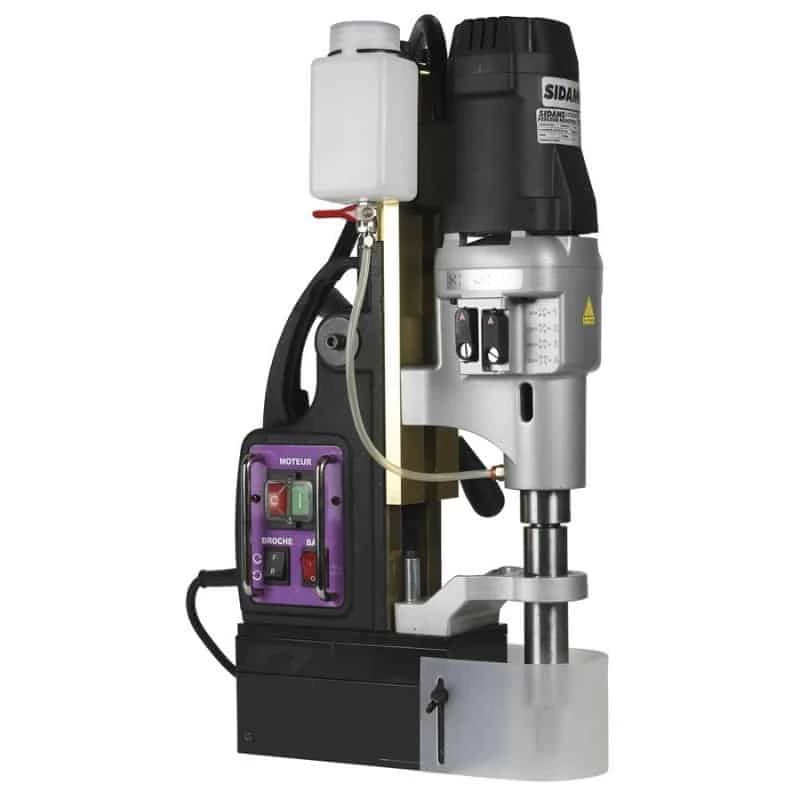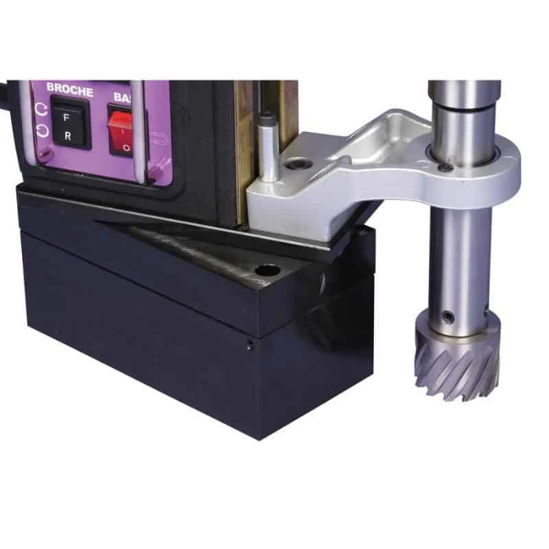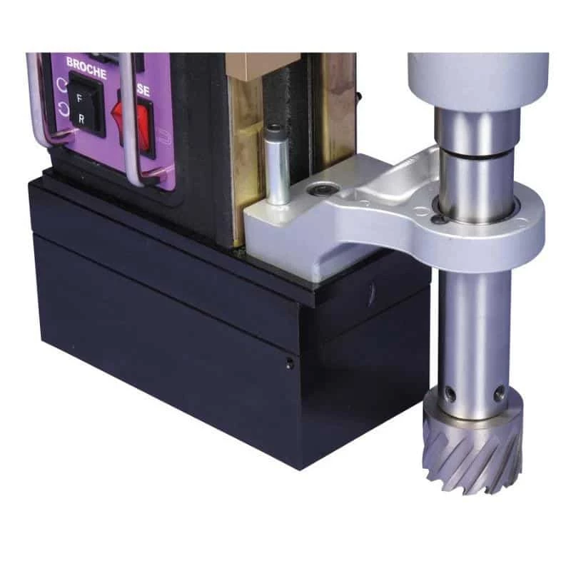 Bien protégé, la machine bénéficie d’un écran de protection. La perceuse magnétique est également équipée d’une broche CM3 et d’un réservoir à liquide de coupe intégré. L’inversion de rotation est adaptée pour le taraudage M3 à M14.